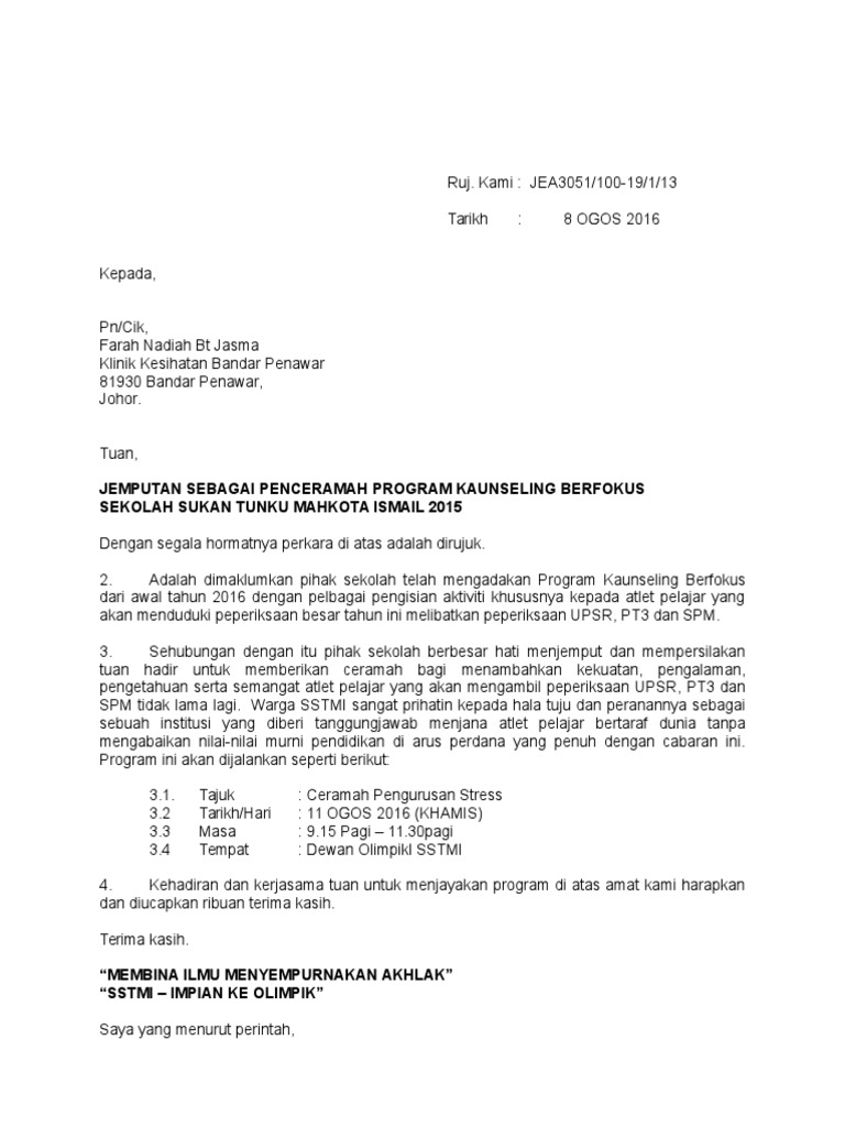 Https Docs Jpa Gov My Docs Se 2020 Se14022020 Pdf from Tuan, jemputan sebagai penceramah program rintis hidangan sihat sekolah (hits ). Surat menjemput penceramah kesihatan ke sekolah. **mata kredit di tuntut atas lantikan sahaja dan bukan pada setiap kali kehadiran mesyuarat. Hasil diatas adalah hasil pencarian dari anda contoh surat jemputan penceramah mp3 dan menurut kami yang paling cocok adalah contoh. Dalam hal ini ada banyak jenis surat pengajian yang mungkin dipergunakan. Beberapa diantaranya adalah surat undangan pengajian akbar, pengajian rutin, pengajian pernikahan. Your email address will not be published. Taklimat & lantikan sebagai hakim bahas peringkat daerah 2018 →.